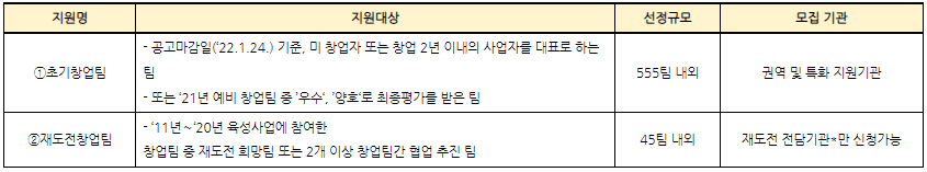 ▲ 신청유형: ① 초기창업팀, ② 재도전창업팀으로 구분