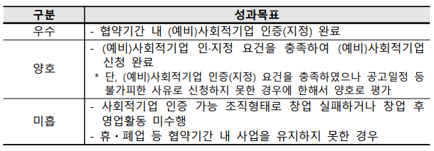 | 작성요령 | 정부 지원사업은 사업 종료 이후, 달성해야 되는 성과 목표가 명시됩니다. 사회적기업가 육성사업은 협약기간 내에 (예비)사회적기업 인증(지정)을 받아야 합니다. 사회적기업 인증은 상시접수제로 운영되어, 신청서 작성에는 요건 방안, 준비 사항 그리고 지원 시점 등을 명시하여, 성과 목표를 달성하기 위한 구체적인 계획을 작성하시기 바랍니다. |