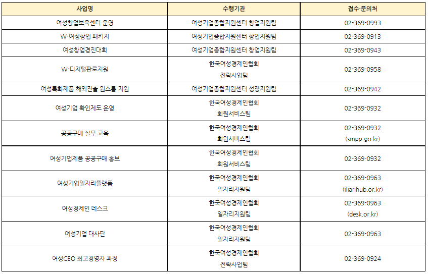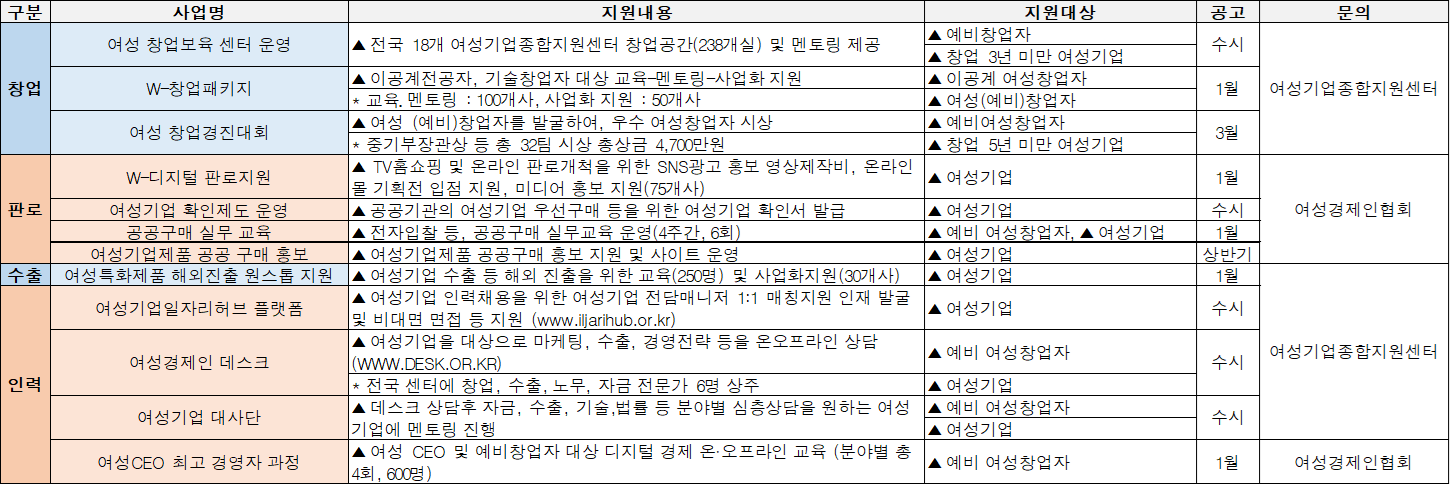 △ 문의처: 한국여성경제인협회 및 여성기업종합지원센터 여성기업 종합포털 (02-369-0900)