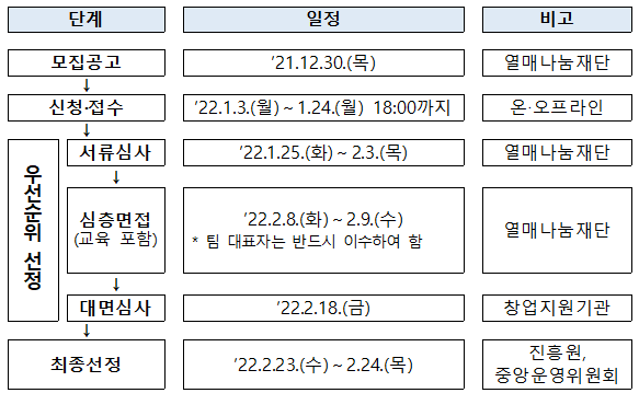| 특이사항 | 작성 요령, 사업 안내 등 온라인 사업설명회가 진행됩니다(유튜브 “열매나눔재단” 채널 라이브) (1차) 2022년 01월 11일(화) 14:00-15:40 (2차) 2022년 01월 18일(화) 19:00-20:40 |