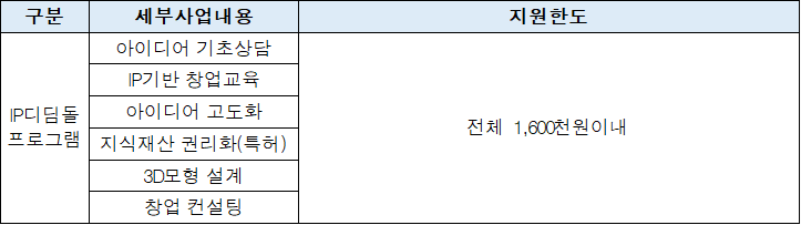 | 지원사항 | 아이디어 고도화ㆍ권리화 컨설팅, IP창업Zone 인프라를 활용한 창업교육 및 멘토링 등 지원 |