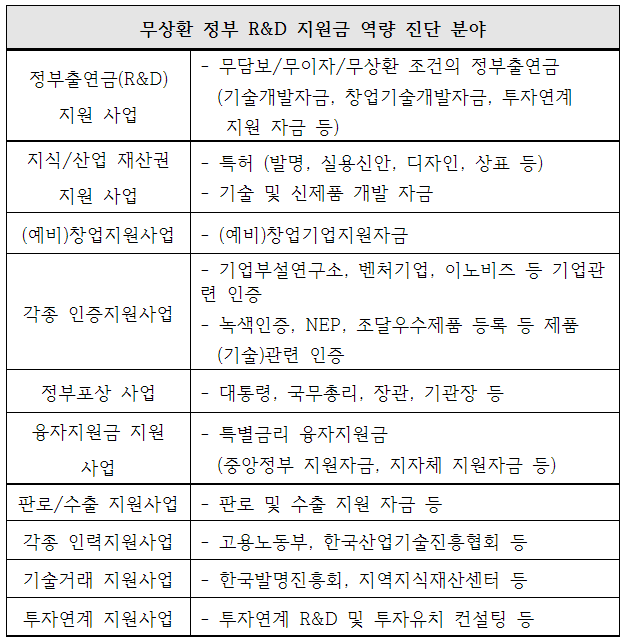 | 지원대상 | 무상환 R&D 정부지원금 조달이 필요한 모든 중소기업(예비창업자 포함) |