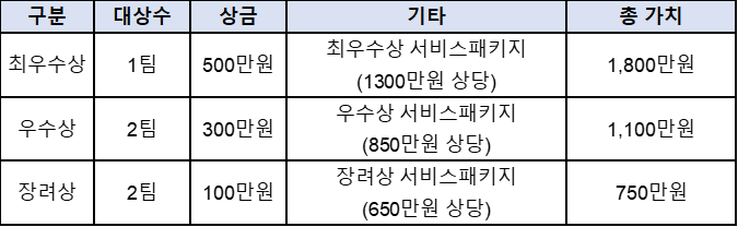 * 서비스 패키지의 유효기간은 1년이며, 상금 수령 후 1년 이내 한중국제창업혁신센터 내 법인 설립 시 제공됨