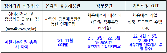 | 지원사항 | 성공적 채용을 위한 과정, 초중급 과정 훈련 수료생과의 채용연계 우선 등 지원 |