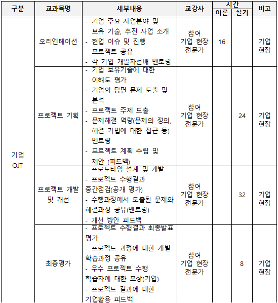 △ 주의사항: 멀티캠퍼스에서 s/w 교육을 이수한 훈련생을 대상으로, 기업에서는 프로젝트 수행하는 PBL (Project Based Learning) 중심으로 채용 후 기업에서 80시간의 훈련과정이 필요합니다. 이와 관련해서 샘플을 공유합니다.