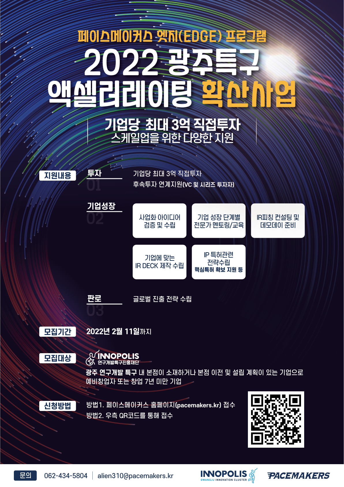 오늘은 '연구개발특구 진흥재단(INNOPOLIS), 페이스메이커스'가 주관하는 '페이스메이커스 EDGE Program 2022 광주특구 액셀러레이팅 확산사업'에 대해서 알아봤습니다.