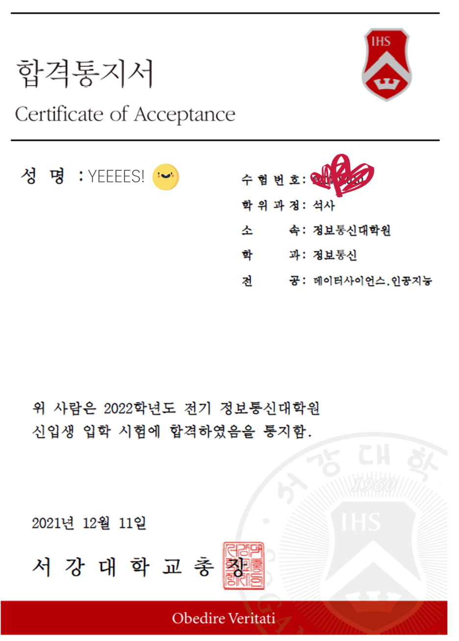 결론적으로 2021년 하반기 지원 그리고 2022년 상반기 지원하여, 2022년 서강대학교 상반기 정보통신대학원에 합격했습니다. 다만 대학원 지원 과정은 긍정적이지는 않았습니다.