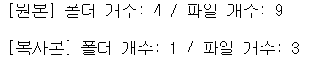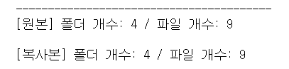 이를 활용해, 원본과 복사본의 폴더와 파일 개수를 확인 가능합니다.