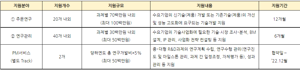 △ 지원사항: 수요기업이 자체 R&D 과정에 필요한 R&D 서비스 전 분야(주문 연구, 연구관리 + PM 서비스 포함) 지원