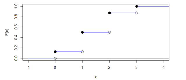 동전 세 번 던져 앞면이 나오는 사건에 대해 누적분포함수를 그리면 아래와 같습니다. 그래프에서 볼 수 있듯이 누적분포함수는 항상 연속적으로 그려지지는 않습니다.
