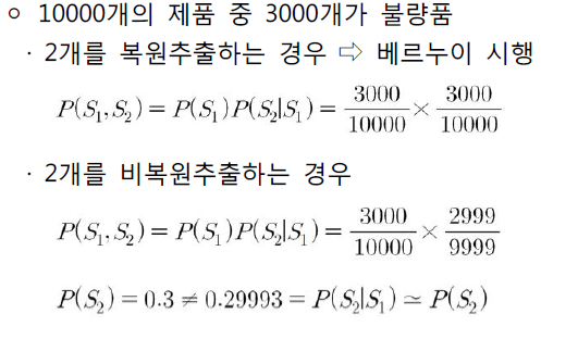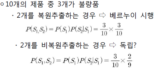 2개를 복원 추출하는 경우는 불량품이 뽑힐 확률이 항상 3/10이기 때문에 베르누이 시행이라고 할 수 있습니다. 결과의 확률이 항상 동일하고, 실험이 독립적으로 수행되었기 때문입니다. 이때 독립 여부는 실험의 교집합이 각각의 확률의 곱으로 이뤄졌기 때문입니다. 하지만 비복원 추출의 경우 두 번째 추출은 첫 번째 추출 결과에 영향을 받기 때문에, 독립사건이 아니므로 베르누이 시행이라고 할 수 없습니다.