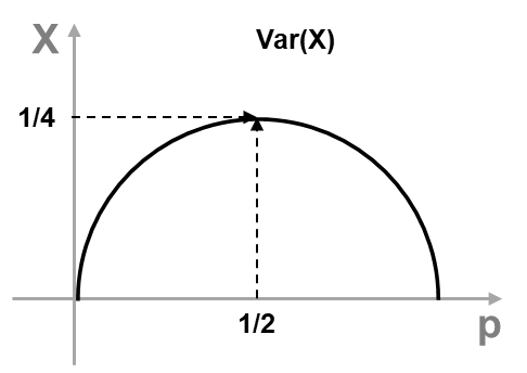 기댓값은 성공 확률 p를 따르며, 분산은 성공 확률 p와 실패 확률 (1-p)의 곱으로 이뤄집니다. 분산을 그래프로 그리면, p가 1/2일 때 최댓값을 가지는 것을 볼 수 있습니다. 이처럼 베르누이 확률분포는 성공 확률이 p에 의해 확률과 기댓값이 결정됩니다. 이와 같이 분포의 특성을 결정하는 상수를 모수(parameter)라고 합니다.