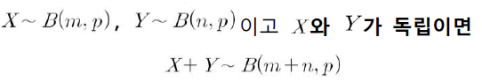 이항분포는 성공 확률이 동일하고 서로 독립인 이항 확률변수의 합도 이항분포를 따릅니다. 두 확률변수 X와 Y가 각각 X ~ B(n, p), Y ~ B(m, p)이고 서로 독립이라면, 확률변수 X와 Y의 합인 시행 횟수 n+m, 성공 확률이 p인 베르누이 시행을 한 확률변수로 간주합니다. 이에 따라 X+Y ~ B(n+m, p)가 됩니다.