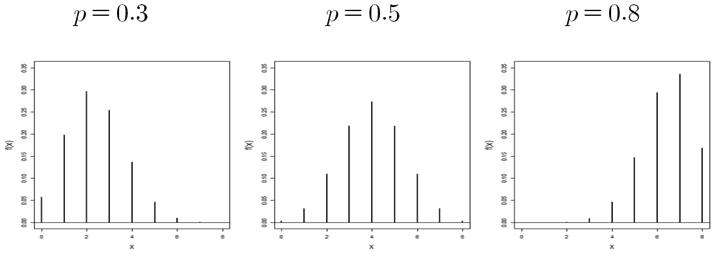 확률변수 X가 모수 n, p를 따르는 이항분포는 X ~ B(n, p)로 표시합니다. 아래는 성공 확률 p에 따라 그래프입니다. 성공 확률이 0.5일 때는 대칭 모습을 가지며, 0.5보다 작을 때는 작은 값이 더 많기에 왼쪽으로 기울어진 그래프가 되며, 반면에 0.5보다 클 경우에는 큰 값이 많기에 오른쪽으로 기울어진 그래프가 됩니다.