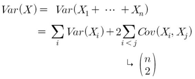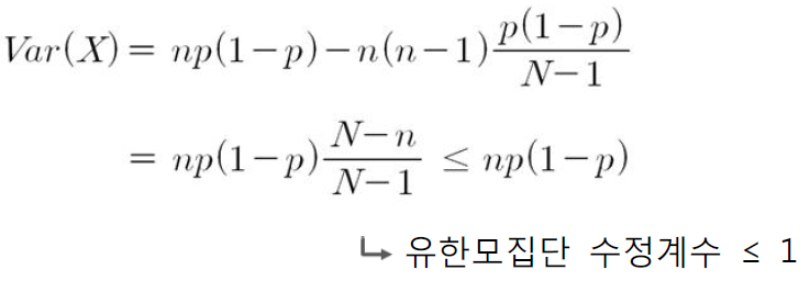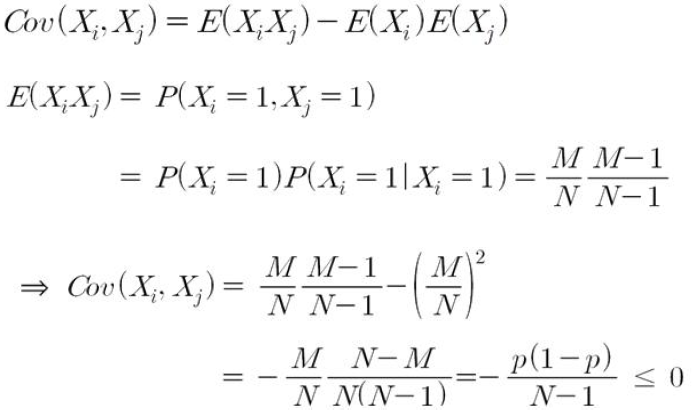 분산의 경우, 이항분포와 다르게 비복원 추출로 진행되기에 각각의 시행이 독립이 아닙니다. 따라서 공분산 계수를 더해서 구해야 됩니다.