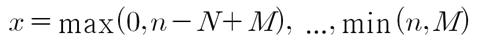 여기서 X의 최댓값은 n과 M 중 작은 값인 min(n, M)이 되며, X의 최솟값은 max(0, n-N+M)가 됩니다. 추가적으로 N(모집단)이 충분히 크고 n(표본의 크기)이 상대적으로 작은 경우에는, 비복원 추출의 결과를 베르누이 시행으로 간주할 수 있으며, 이에 따라 초기화 분포는 p = M/N인 이항분포로 근사할 수 있습니다.