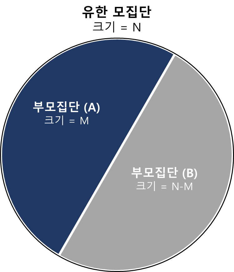 모집단이 유한하며, 크기가 N인 모집단에서 크기가 M과 N−M인 두 개의 부모 집단 (A, B)에서 n 개의 표본을 비복원 추출할 때, 목표하는 부모 집단(A)에서 추출된 표본 수의 분포를 의미합니다. 비복원으로 추출하기에, 각 표본의 추출 과정은 독립적이지 않은 특징이 있습니다.