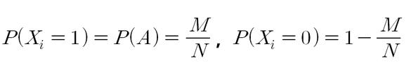 초기하 분포의 각 시행에서 목표하는 부모 집단 (A)에서 추출되면 1 값을 가지고, 다른 집단에서 추출되면 0으로 표시한 확률변수의 합으로 표시하면, 각 집단에서 추출되는 확률은 아래와 같습니다.