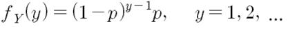기하 분포에서 X는 성공할 때까지 시행했을 때의 '실패한 횟수'를 의미합니다. Y는 '성공할 때까지 시행한 횟수'를 의미합니다. 이 둘의 관계는 Y=X+1의 관계를 이룹니다. 이를 바탕으로 Y에 대한 확률 질량 함수는 아래처럼 정리됩니다.