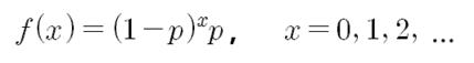 기하 분포에 따라 x 번째 시행에 성공할 확률 (x-1 번째까지 실패할 확률)은 아래와 같으며,