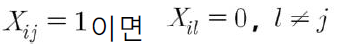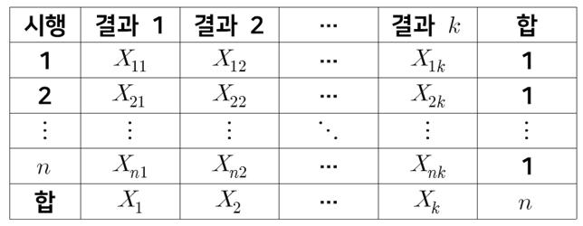 여기서 Xij는 (i 번째 범주의 시행)에서 (j 번째 결과)를 의미하며, Xij의 값은 j가 나오면 1, 안 나오면 0을 가집니다. 각각의 시행에는 하나의 결과만이 나올 수 있어서, 각 시행의 합{(1 x 1) + (0 x (k-1)) = 0}은 항상 1을 가집니다.