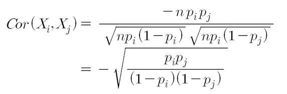 여기서 각각의 시행에는 하나의 결과만이 나오기에, 각 시행의 합{(1 x 1) + (0 x (k-1)) = 0}은 항상 1이 됩니다. 그래서 두 확률변수의 관계는 (1,0), (0,0), (0,1) 세 가지만 가집니다. 이로 인해 두 확률변수 곱의 기댓값은 항상 0 값을 가집니다. (1x0=0, 0x0=0, 0x1=0)