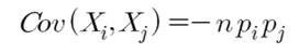 여기서 각각의 시행에는 하나의 결과만이 나오기에, 각 시행의 합{(1 x 1) + (0 x (k-1)) = 0}은 항상 1이 됩니다. 그래서 두 확률변수의 관계는 (1,0), (0,0), (0,1) 세 가지만 가집니다. 이로 인해 두 확률변수 곱의 기댓값은 항상 0 값을 가집니다. (1x0=0, 0x0=0, 0x1=0)