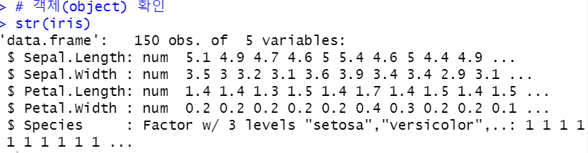 객체의 변수 명과 문자형/숫자형 정보를 확인할 수 있다.