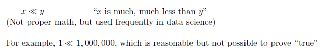 '<<', much much less than 기호는 데이터 사이언스 분야에서 많이 사용됩니다. 이는 대수 비교를 통해 작다는 것을 의미하는 것에서 '<'와 동일하지만, 매우 매우 작다는 것을 강조하는 값입니다. 다만, 매우 작다는 것에 대해서는 사람마다 달라서, 적절한 수학 개념은 아니지만 직관적인 이해를 위해 많이 사용됩니다.