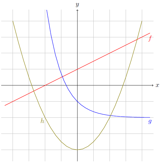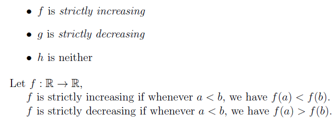 f(x) 함수를 단조증가함수, g(x) 함수를 단조감소함수, h는 둘다 해당하지 않습니다.
