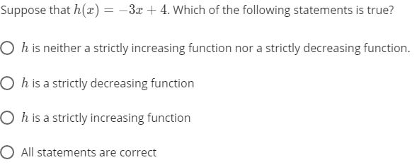 A function is strictly increasing or strictly decreasing if a horizontal line crosses it only once.