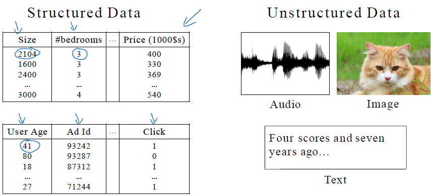 구조적 데이터는 데이터베이스로 표현된 데이터를 의미합니다. 구조화된 형태로 정보의 특성이 잘 정의되어 있습니다. 반면에 비구조적 데이터는 이미지, 오디오와 같이 특징적인 값을 추출하기 어려운 형태의 데이터입니다. 딥러닝 덕분에 컴퓨터가 비구조적 데이터를 인식할 수 있게 되었습니다.