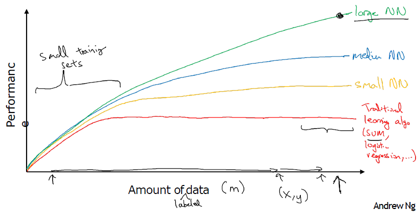 IoT, CPU, GPU 등의 발전을 바탕으로 데이터의 양이 증가하게 되었습니다. 증가한 데이터를 학습하게 됨으로써 딥러닝이 부상하게 되었습니다. 정리하면 딥러닝 성능은 scale의 증가에 따라 향상되었습니다.