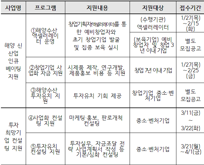 | 지원대상 | 해양수산 분야 (예비)창업자, 중소ㆍ벤처기업 |