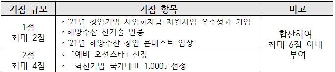 | 작성요령 | 가점항목에 따라 선정(서면)평가에 최대 6점 이내의 가점이 부여됩니다. |