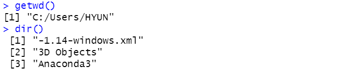 getwd 함수는 현재 작업 경로의 위치를 확인할 수 있는 함수입니다. dir 함수는 현재 작업 경로로 지정되어 있는 경로의 파일명 또는 디렉토리명을 확인할 수 있는 함수입니다.