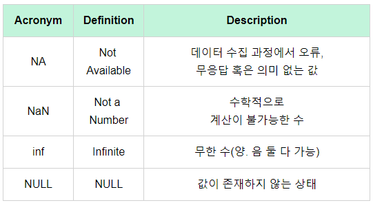 데이터 분석에서 결측치는 분석 결과에 왜곡, 오류 등을 발생할 수 있기에 수정, 대체, 삭제 등의 전처리가 필요합니다. 이러한 결측치는 데이터 수집 과정에서 오류, 무응답 혹은 의미 없는 값 그리고 수학적으로 계산이 불가능한 값 등이 해당됩니다. 오늘은 결측치를 R에서 확인, 수정 그리고 제거하는 방법에 대해서 정리하고자 합니다.