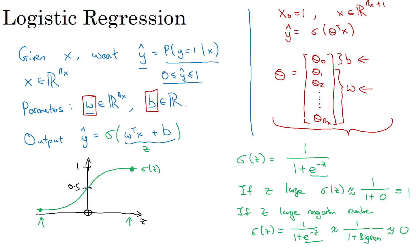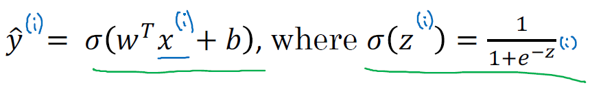 로지스틱 회귀는 이진 분류 문제에 사용되는 알고리즘입니다. 입력 값인 X에 대해서, y(주어진 입력 특성 X에 해당되는 실제 값)가 1일 때의 예측값을 ŷ (P(y=1|X)라고 합니다. 예측값 ŷ은 X일 때 y가 1인 확률을 의미하며, 0 ≤ ŷ < 1 사이의 값을 가집니다. 다만, ŷ = wX + b (w, b = 파라미터, w = 입력 값, b = 잔차)에서 0과 1 사이의 확률 범위를 벗어날 수 있기에, 이때 시그모이드 함수(sigmoid function) 등을 활용해 0과 1 사이의 값으로 변환해줍니다.