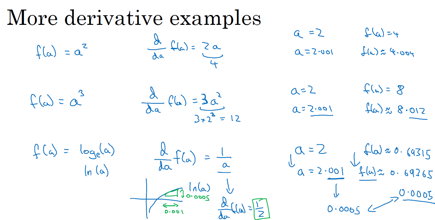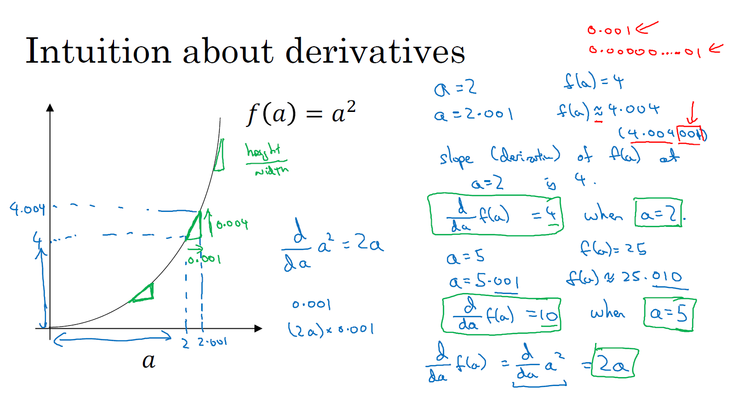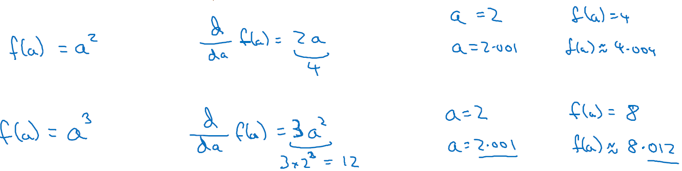 이차함수에서의 도함수도 일차함수와 동일하게 기울기(높이/너비)를 통해서 구할 수 있습니다. a가 2일 때(a=2), 0.0001만큼 약간 오른쪽으로 이동하는 경우(nudging a right by slightly)에 도함수는 4입니다(a=2일 때, d/da = 4)