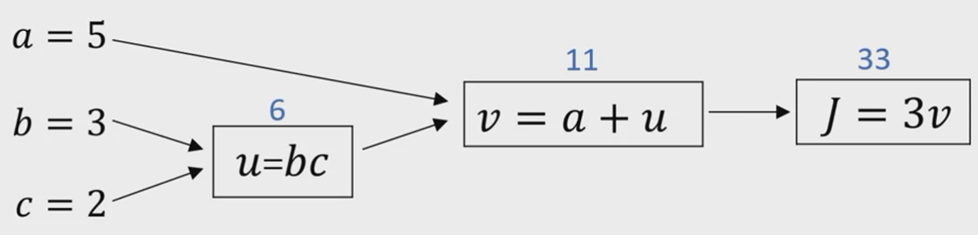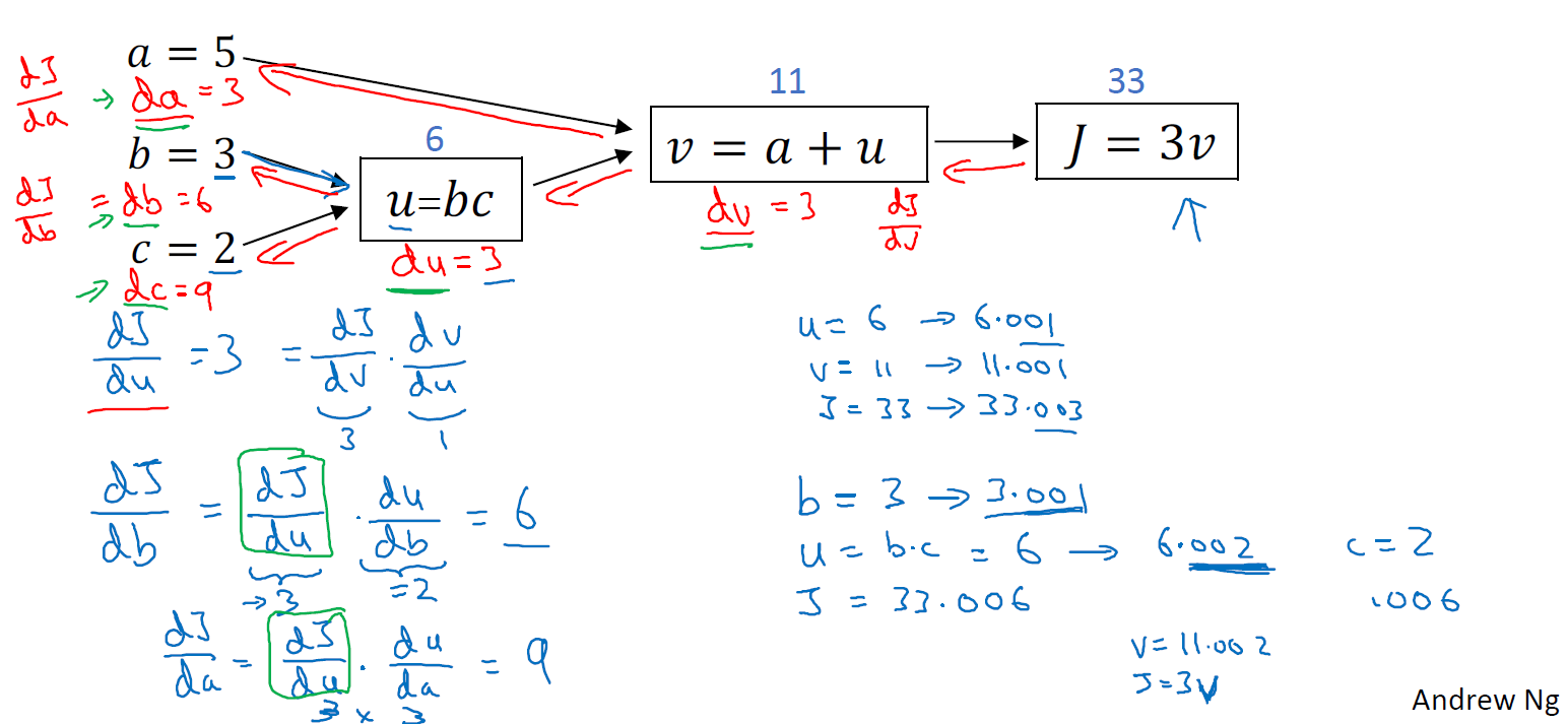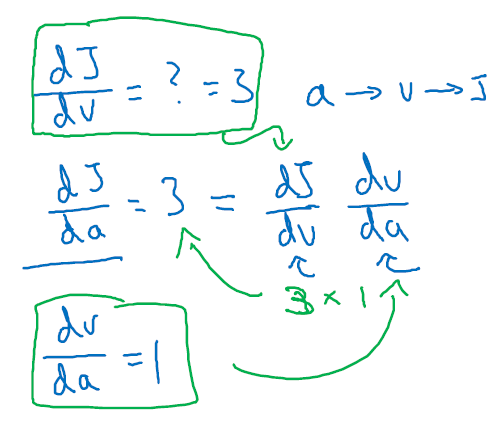 a를 증가했을 때, dv/da만큼 j가 증가할 것입니다. 연쇄 법칙(chain rule)은 합성함수의 미분으로, 위 예제의 경우처럼 a가 v에 영향을 주고, v가 J에 영향을 주는 함수의 derivative 값을 구할 수 있습니다. 연쇄 법칙에 따라 각 변수의 derivative를 (dJ/dv) * (dv/da) 통해 구할 수 있습니다.