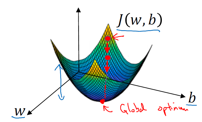 도함수(dw)가 0보다 크면, 파라미터 w는 기존의 w보다 작은 방향으로 이동하고, 반면에 dw가 0보다 작으면, 파라미터 w는 기존의 w보다 큰 방향으로 이동하게 됩니다. 위 과정을 반복하여 비용 함수의 최저점을 찾게 됩니다.