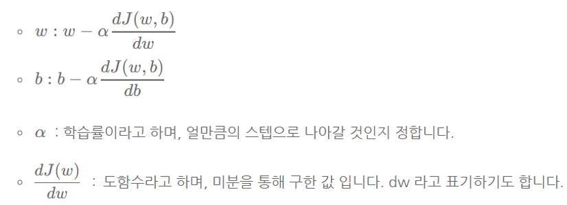 비용 함수가 전체 데이터셋의 예측이 얼마나 잘 되었는지 확인하는 것이면, 경사 하강법(Gradient descent)은 이를 가능하게 하는 파라미터 w와 b를 찾아내는 방법입니다.