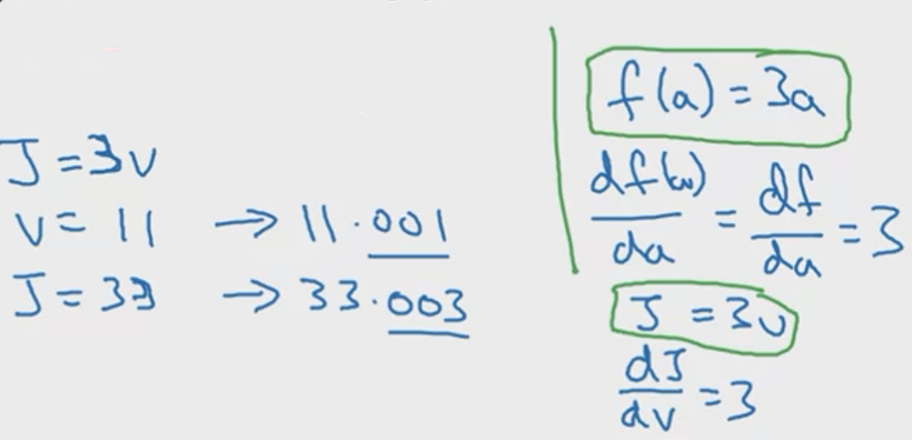 마지막 변수 결괏값(J)에 대해서 derivative를 계산하기 위해, 역방향의 첫 번째 단계(one step backwards)를 진행해보겠습니다. J=3v의 함수에서, v의 값을 올리면(net impact), 함수는 3배만큼 증가하게 됩니다. 이를 바탕으로 derivative값을 3으로 확인할 수 있습니다.