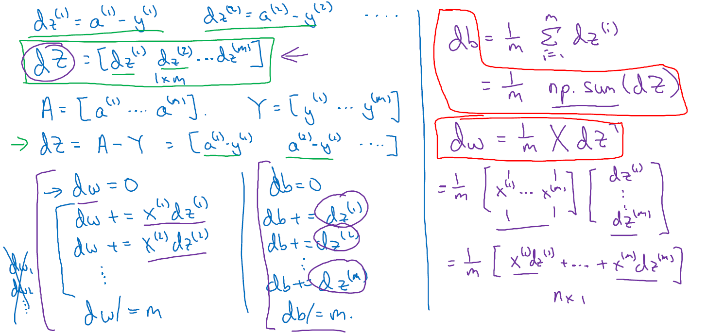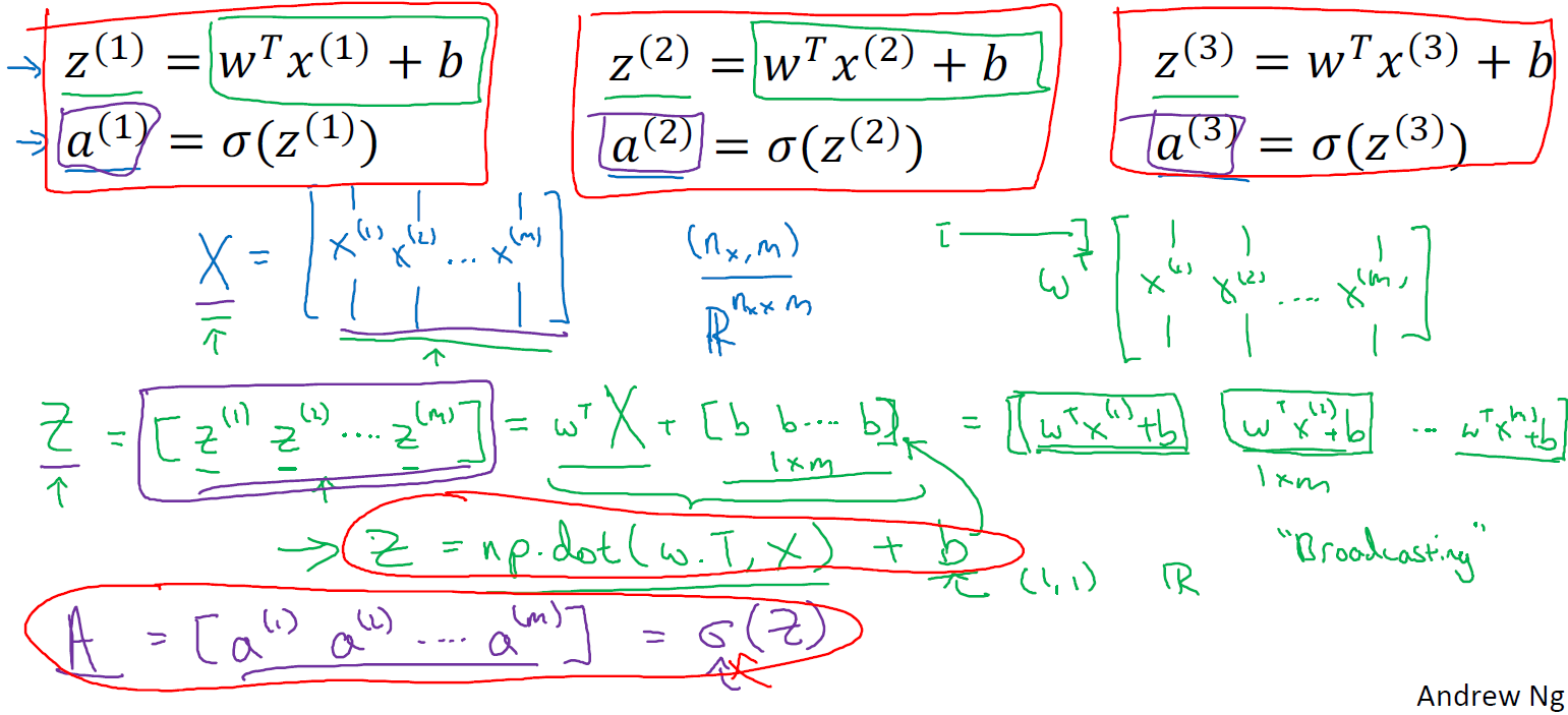 아래 그림처럼 변수 x1, x2, ... xn에 대한 각각의 예측값(a)에 대해서 개별적으로 for-loop를 사용하지 않고, [1 x m] 차원으로 1줄로 행렬을 정리할 수 있습니다.
