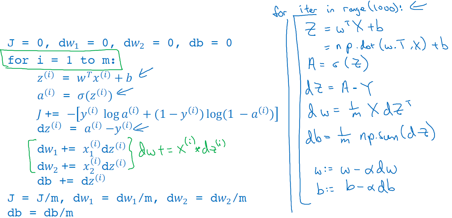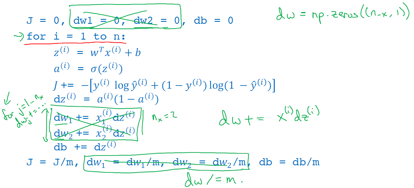 파란색 글씨는 로지스틱 회귀에서 도함수를 구하는 공식입니다. 이를 파이썬의 내장 함수(np.zeros)를 활용해서 기존의 2개의 for-loop를 1개로 줄일 수 있습니다.
