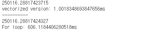 vectorization과 non-vectorization을 아래 코드를 통해 실제 소요 시간을 살펴보면, vectorization 했을 때는 1.00ms가 소요된 것에 비해 non-vectorization의 for loop 코드는 600ms로 약 600배 차이가 난 것을 볼 수 있습니다. cpu, gpu 성능에 따라 차이가 있겠지만, 여기서 중요한 점은 "for loop 구문을 사용하는 것을 피하는 것'입니다.