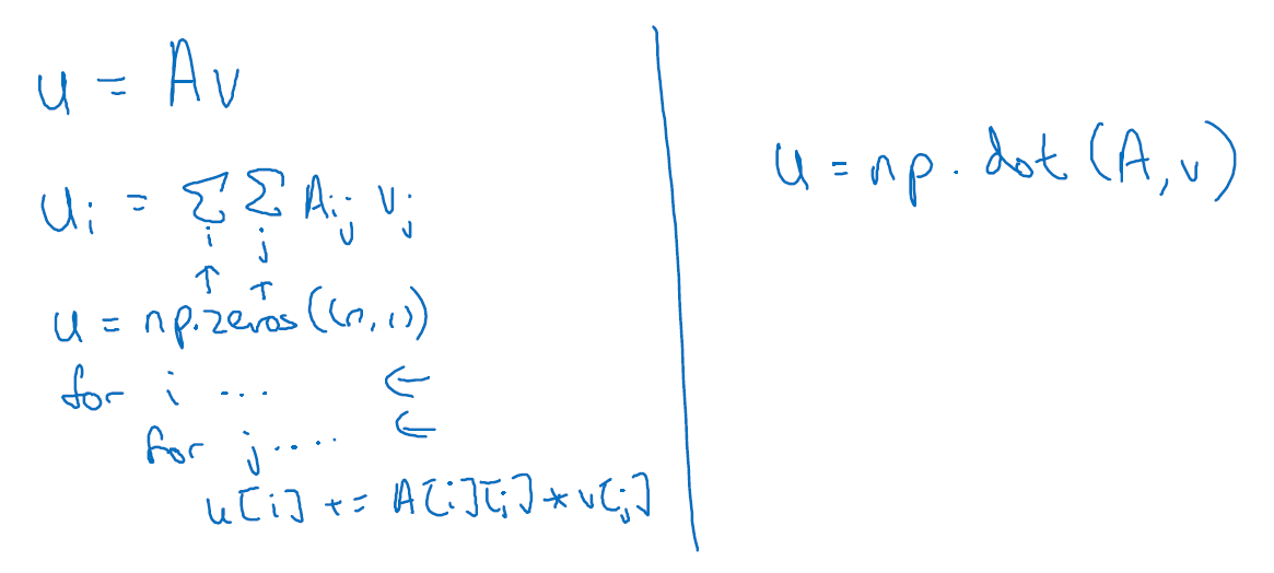 임의의 함수 u = Av에 대해서 계산을 하게되면, non-vectorized의 경우는 for-loop를 2번 사용하는 것에 비해, vectorized는 내장 함수 np.dot()을 활용해 1줄의 코드로 작성할 수 있습니다.