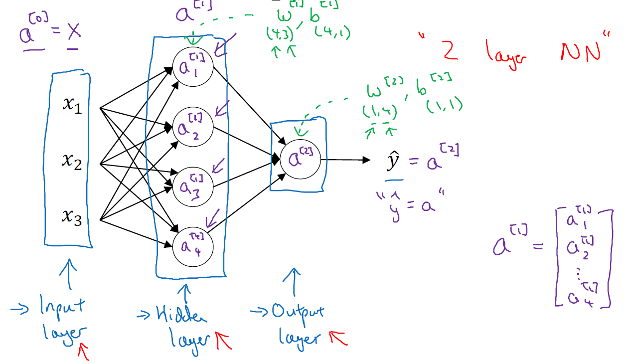 위 그림의 신경망(Neural network)은 1개 은닉층을 가지는 얕은 신경망(shallow neural network)으로 1개의 각 입력층, 은닉층, 출력층을 가지고 있습니다. 위 은닉층은 (4 x 3) 벡터로, '4행'은 첫 번째 좌표로 해당 층(은닉층)에 있는 노드를 의미하며, '3열'은 두 번째 좌표로 입력 특성(입력층)이 3개를 가지고 있다는 것을 의미합니다. 그리고 출력층은 (2 x 4) 벡터로, '2행'은 첫 번째 좌표로 해당 층에 있는 노드를 의미하며, '4열'은 두 번째 좌표로 입력 특성이 4개를 가지고 있다는 것을 의미합니다.