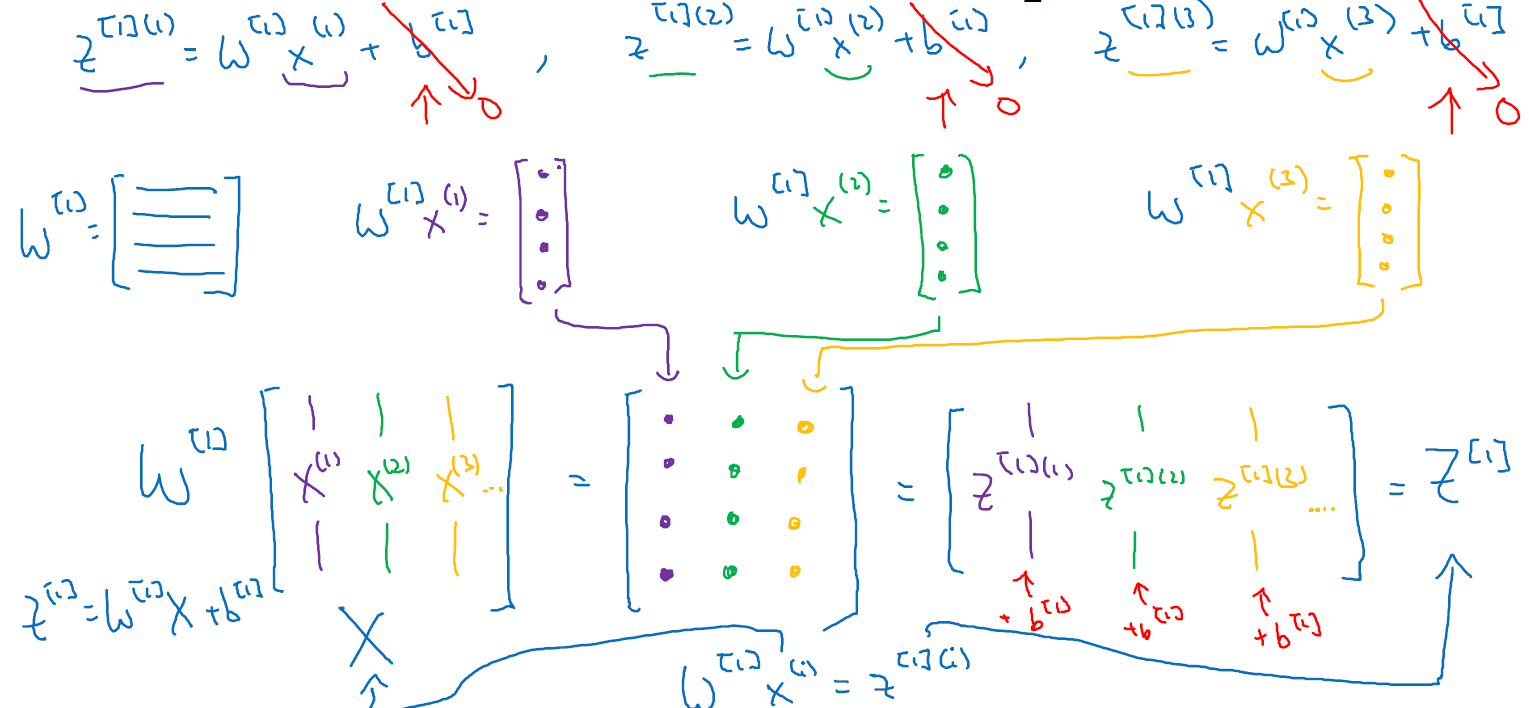 잔차 b가 0인 값이라는 것을 가정해서 구하게 되면, 가중치 w와 샘플 x를 곱해서 결괏값 z를 얻게 됩니다. 이를 벡터화해서 1줄로 간단히 정리할 수 있습니다. 추가적으로 잔차 b가 0이 아닌 경우에는 파이썬 broadcasting과 동일하게 열(column) 벡터 항목이 더해집니다.