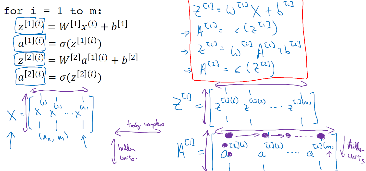 벡터화를 함에 있어 중요한 부분은 표기법을 정확하게 입력하는 것입니다. 입력층은 신경망에서 [1]로 표기되지 않기에, 각 층에 순서를 헷갈리면 안 됩니다. 여기서 [1]은 은닉층(Hidden layer), [2]는 출력층(Output layer)이며, 입력층은 [0]로 표기합니다.